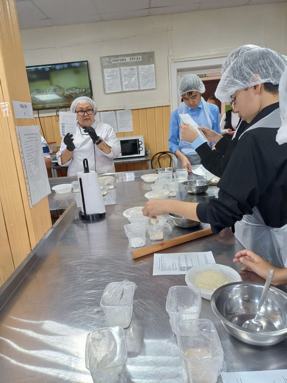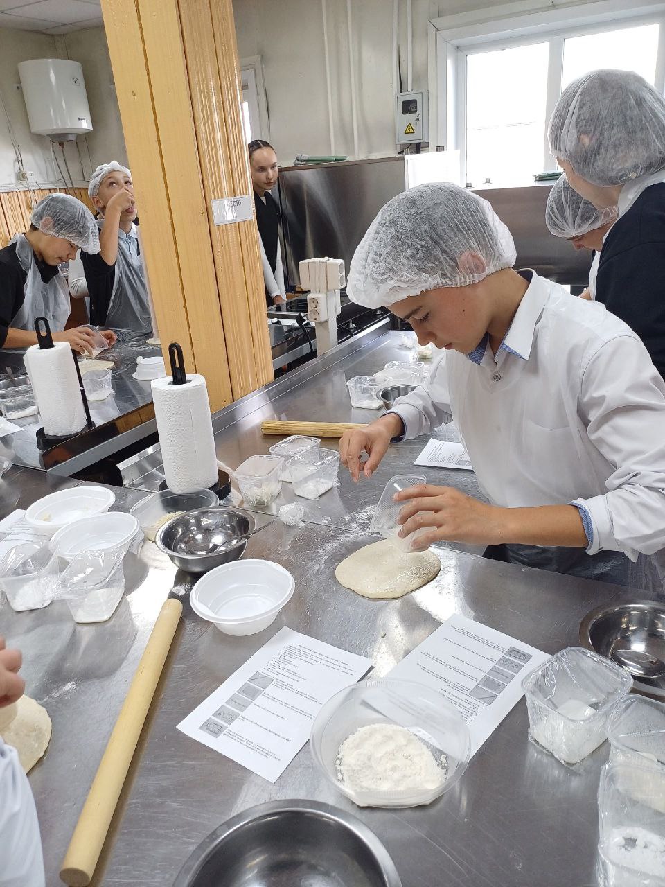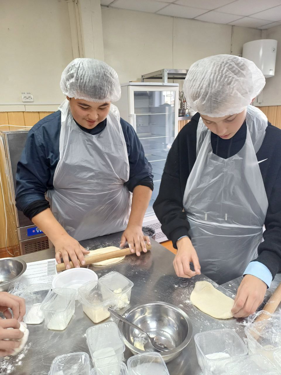 Ребята с увлечением пекли ароматные булочки Синнабон, наполняя техникум восхитительным запахом корицы и ванили. Параллельно с этим, другая группа ребят осваивала приготовление популярной ближневосточной закуски – шаурмы с сочным куриным филе. Каждый этап, от нарезки овощей до заворачивания начинки в лаваш, проходил под чутким руководством опытных наставников.